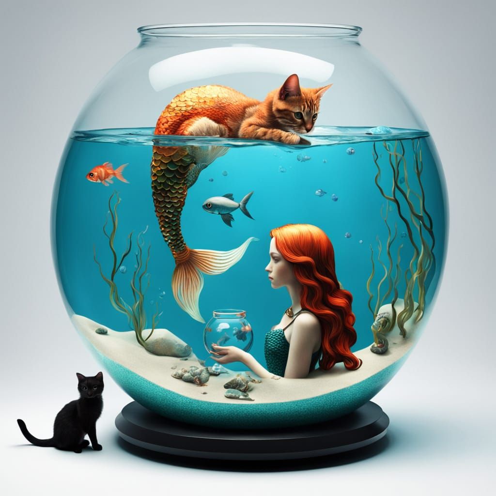 This surreal image shows a mermaid inside a fishbowl, observed by a kitten. It features realistic, dramatic lighting for a captivating visual effect.