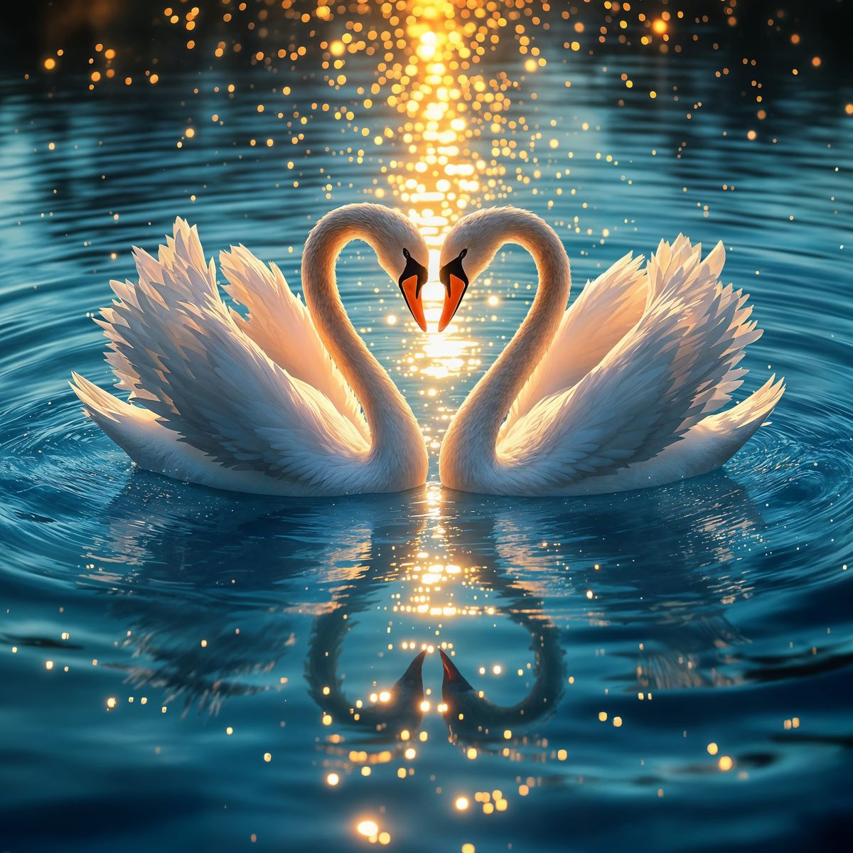 This image captures the serene beauty of two swans forming a heart in a sparkling pool of water, surrounded by the vibrant colors of a dazzling sunset, with intricate details and ultra-sharp focus.