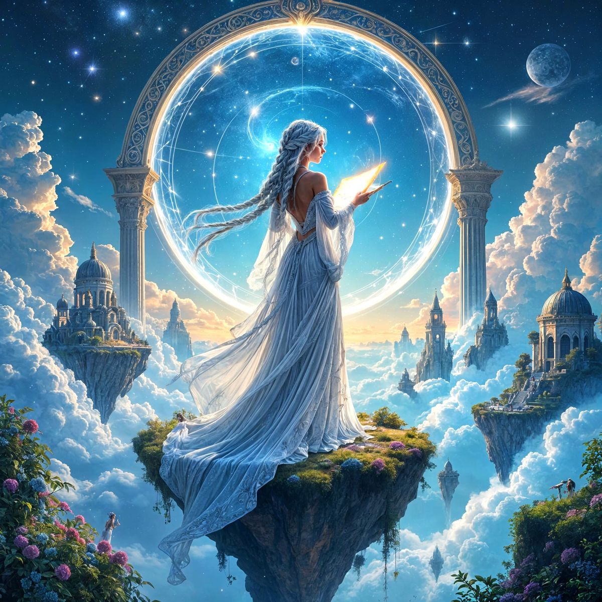 This image shows a celestial cartographer charting cosmic currents amidst floating islands. Rendered with intricate details and photorealistic lighting, the dreamy, otherworldly scene is reminiscent of hyper-fantasy art.