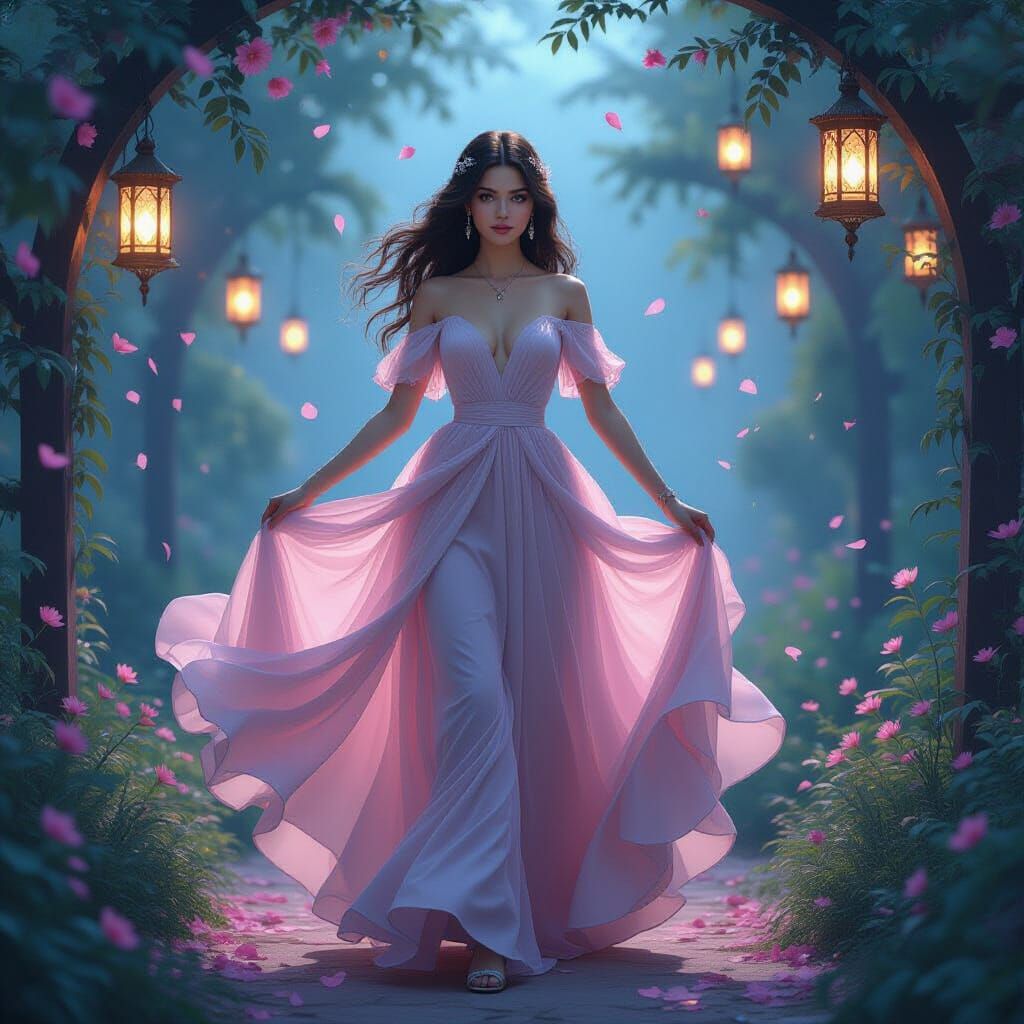 A captivating image of a woman dancing in a magical garden at twilight. The artwork evokes cinematic realism with ethereal lighting and elegant character design in a digital art style.
