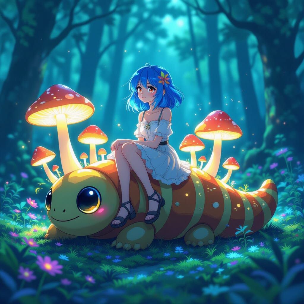 This image shows an anime woman with blue hair sitting on a friendly caterpillar. The scene is set in a bioluminescent forest with sparkling moss and colorful plants, rendered in a cel-shaded style with deep colors.