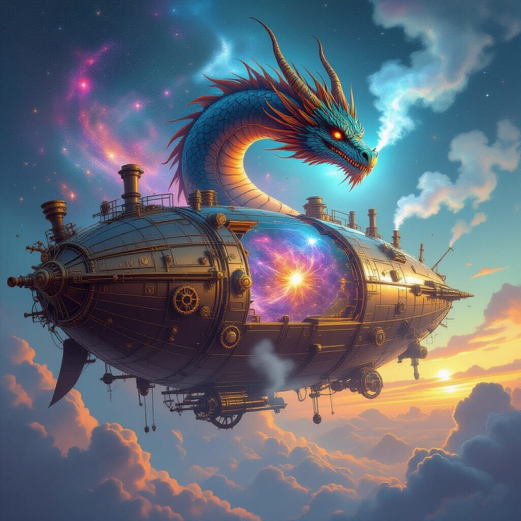A cosmic dragon coils around a wrecked steampunk airship, its translucent body filled with stars. Glowing arcane symbols adorn its scales amidst brass gears, rendered as vibrant matte painting.