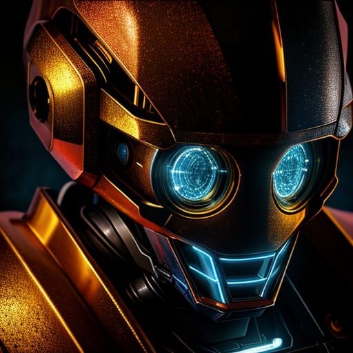 A striking picture of a polished, rusty robot in a surreal close-up. The robot features glowing blue circuits and metallic textures, set against a misty golden backdrop. It is rendered in a vibrant oil painting style.