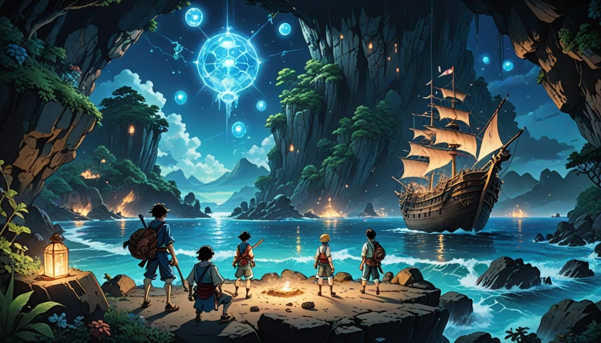 This image shows a group of pirates trading magical artifacts in a hidden cove. The scene features glowing runes, bioluminescent water, and dramatic lighting, all rendered in an adventure anime style.