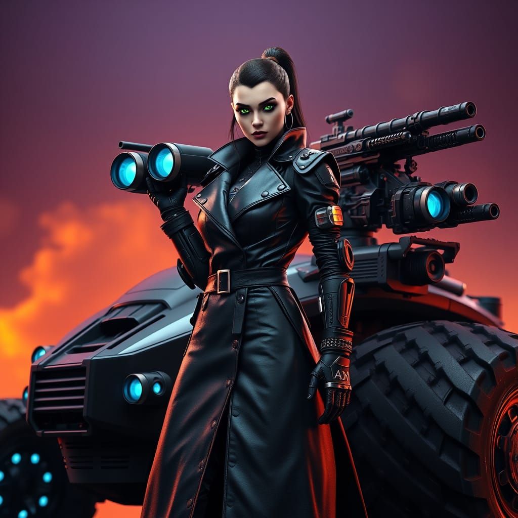 This image depicts a heavily-armed, goth-inspired cyborg woman standing proudly beside a heavily-armored vehicle, rendered in stunning 8K resolution with polished metal reflections and a deep orange and purple hue. The artwork combines futuristic and sci-fi elements, reminiscent of Syd Mead's style and c...