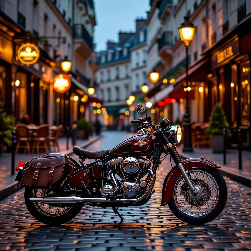This image shows a vintage motorcycle parked on a worn cobblestone street in Paris. Ornate architecture is softly illuminated by warm streetlights in a style reminiscent of impressionist paintings.