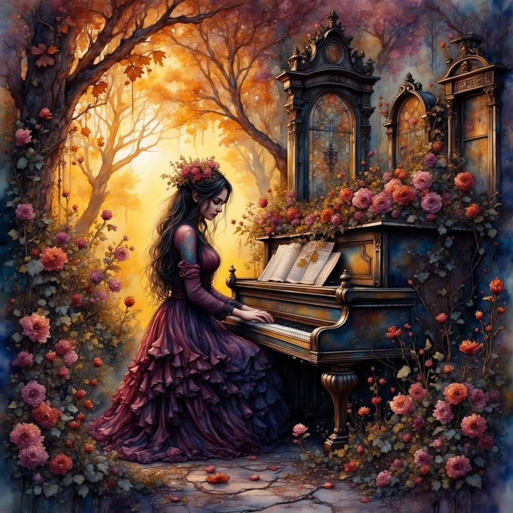 This image depicts a hauntingly beautiful piano within a gothic Victorian manor during a golden autumn sunset. Rendered in a delicate watercolor style, it evokes a sense of nostalgic beauty and quiet reflection.