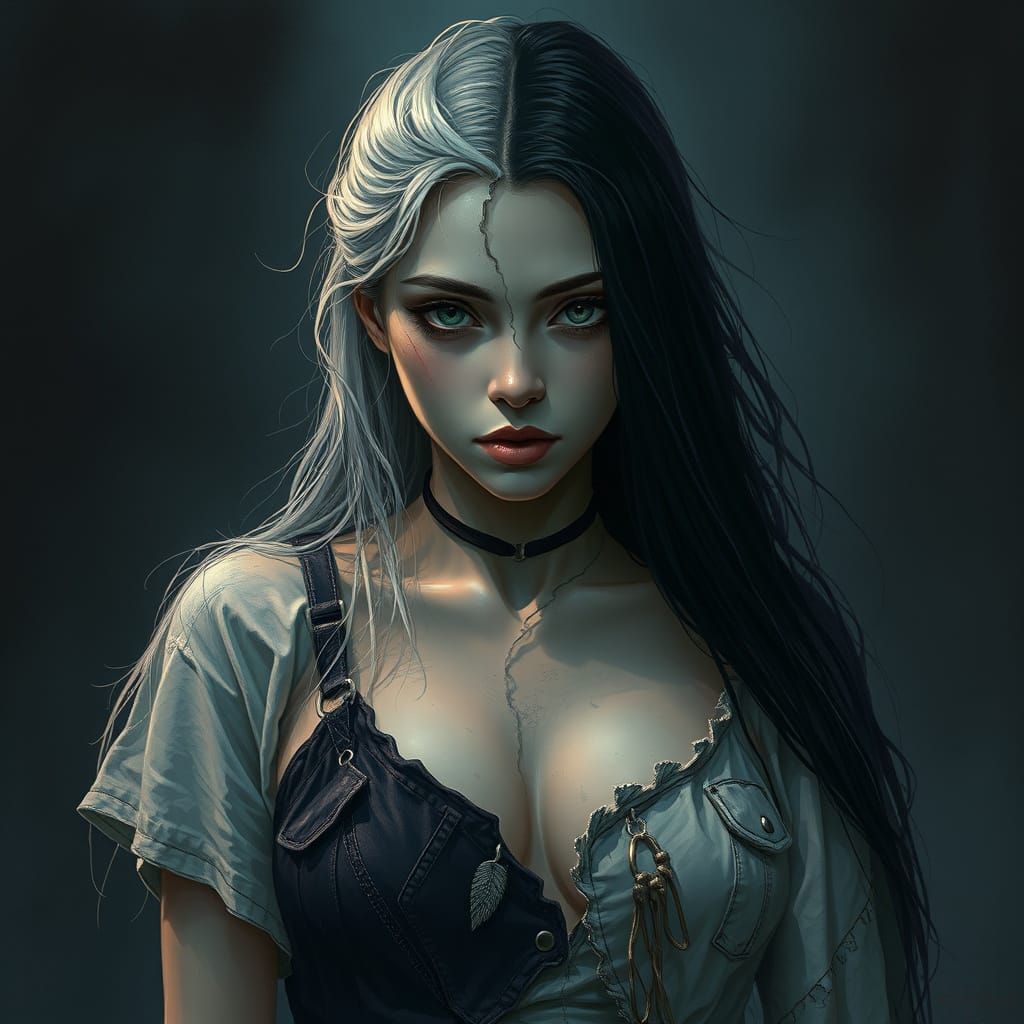 This image shows a biracial woman split into two halves, white and black, wearing tattered clothes. It evokes a dark and eerie atmosphere with fantasy elements, reminiscent of haunting illustrations.