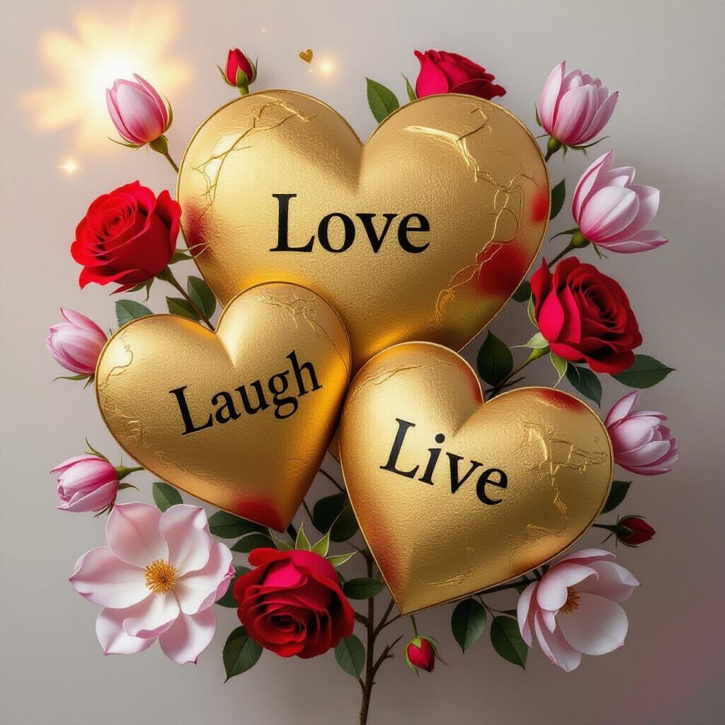 A striking impasto painting of three golden hearts overlapping. Each heart has fine black engravings and words in deep black for strong contrast. Soft red roses and pale pink magnolias surround the hearts in a dreamy mist.