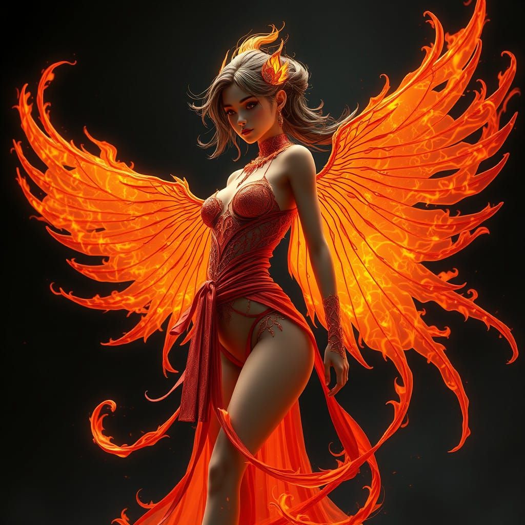 A breathtaking image of a female figure with intricately designed, flame-licked attire and delicate, wispy tendrils of flame dancing across her skin and wings, reminiscent of anime and 3D art, with an aesthetic that is both awe-inspiring and majestic, as if crafted by the finest digital artisans.