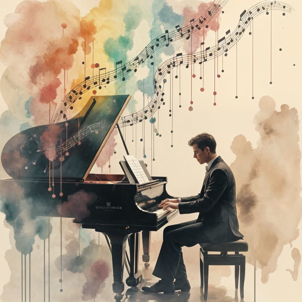 This abstract image depicts a man playing a piano, with musical notation dripping vertically. It features pastel colors and a faint, sepia-toned, double-exposure effect, reminiscent of watercolor.