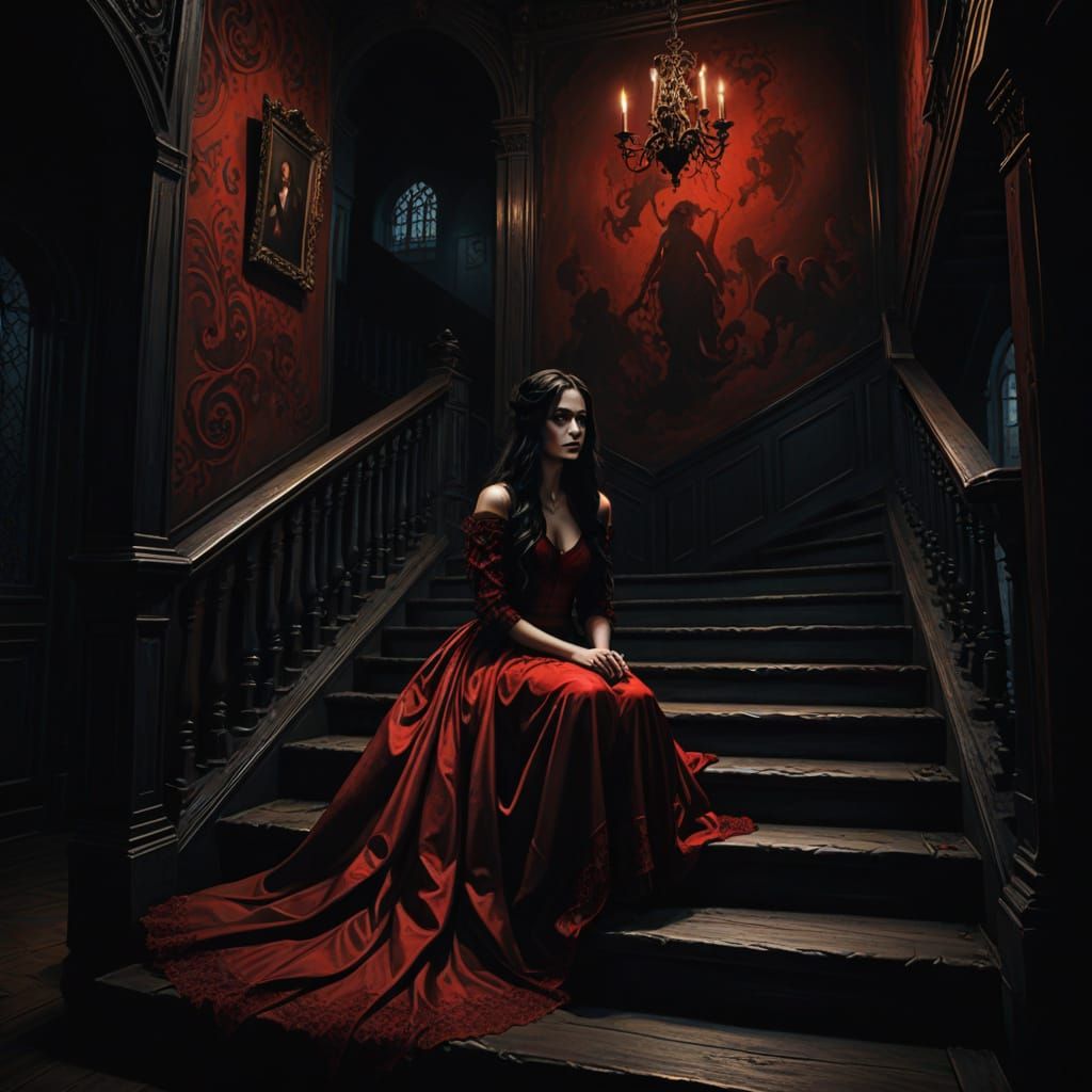 A photorealistic image of a woman with long dark hair in a flowing red dress, sitting on a wooden staircase. The gothic art style features dramatic lighting, dark shadows, and a red and black color palette.
