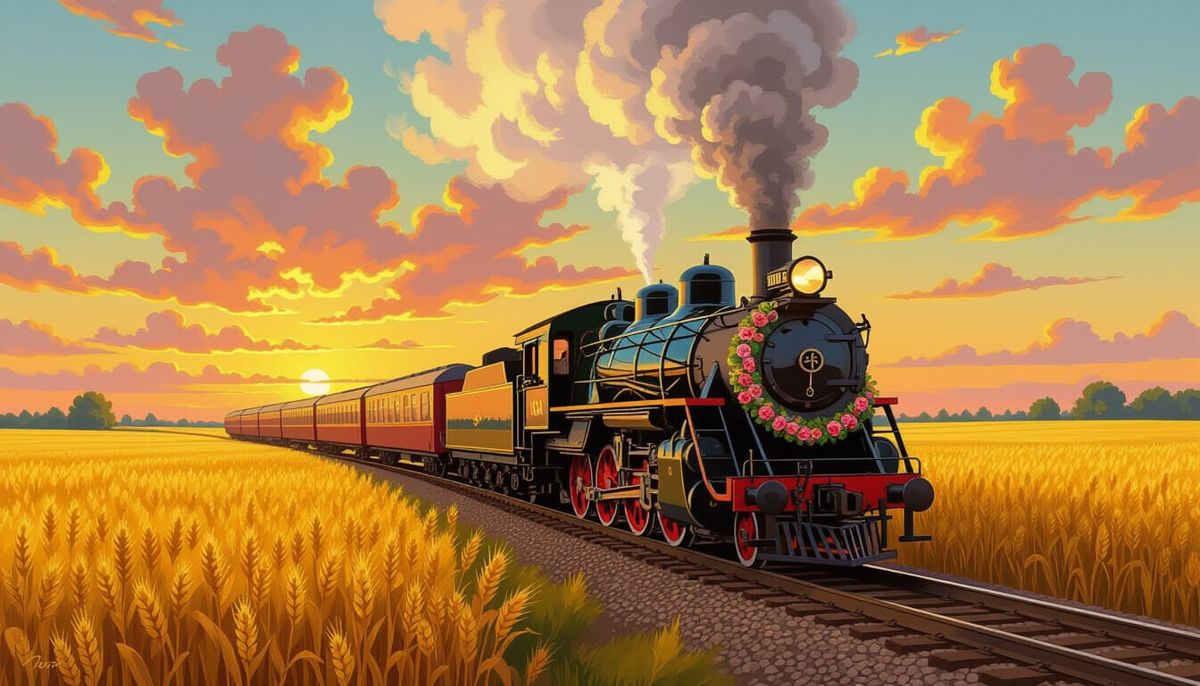 A vintage steam train with floral garlands travels through a golden wheat field at sunset. Rendered in a vivid oil painting style with rich impasto textures and bold brushstrokes.