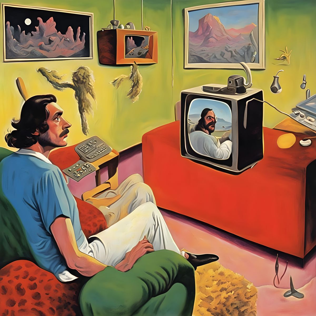This image depicts a surreal comic-style scene. A man watches television, and the screen reflects vivid, hallucinatory depictions of his life in a colorful, disturbed 1980s aesthetic.