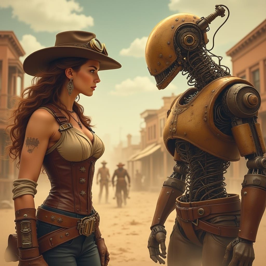 A vintage-style movie poster reimagines a Western showdown with a steampunk cowgirl facing a robotic sheriff in a sepia-toned frontier town.