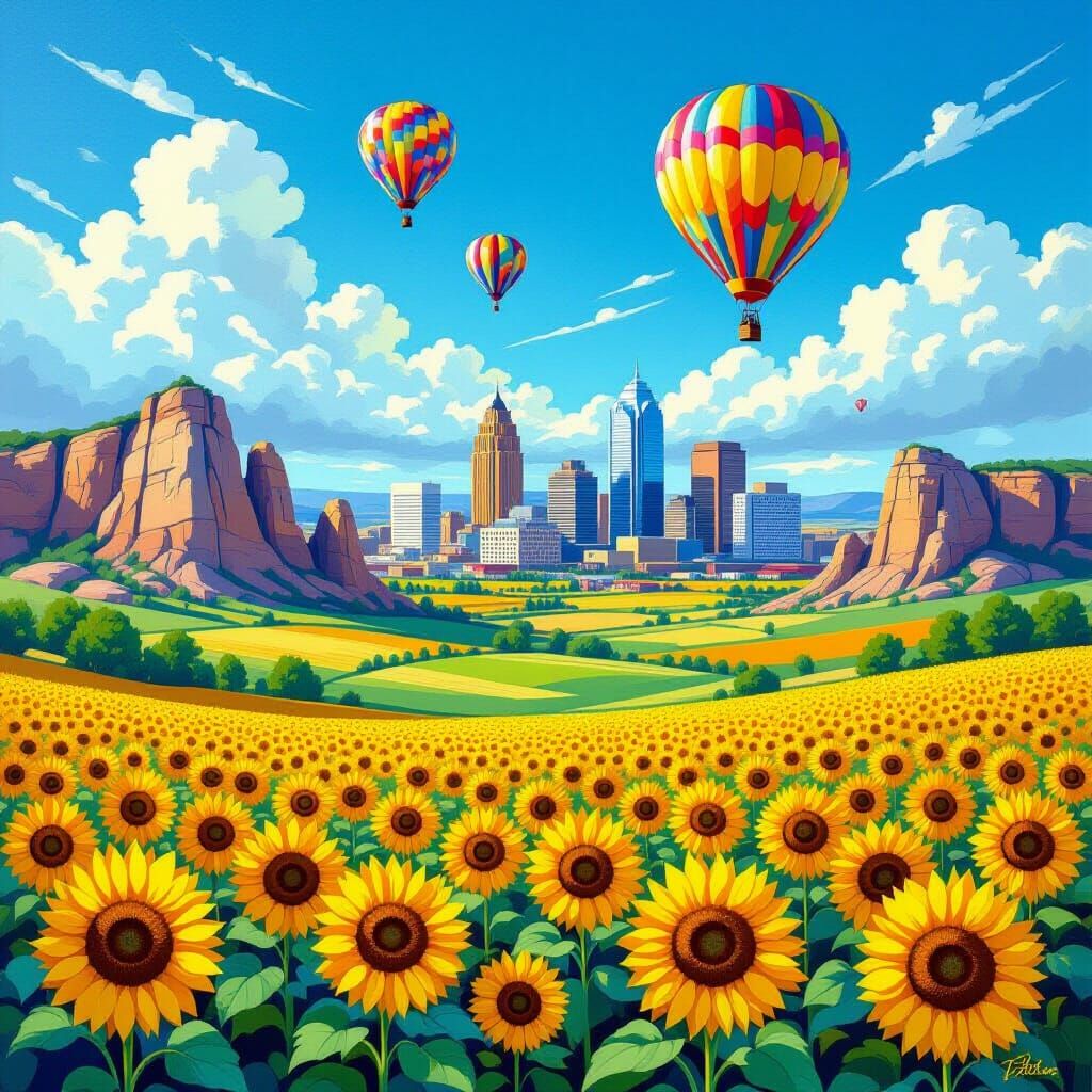 A vibrant image showing the Kansas landscape, featuring rocky formations and colorful hot air balloons set against a bright blue sky. The scene includes a city skyline, green farmlands, and sunflower fields as digital art.
