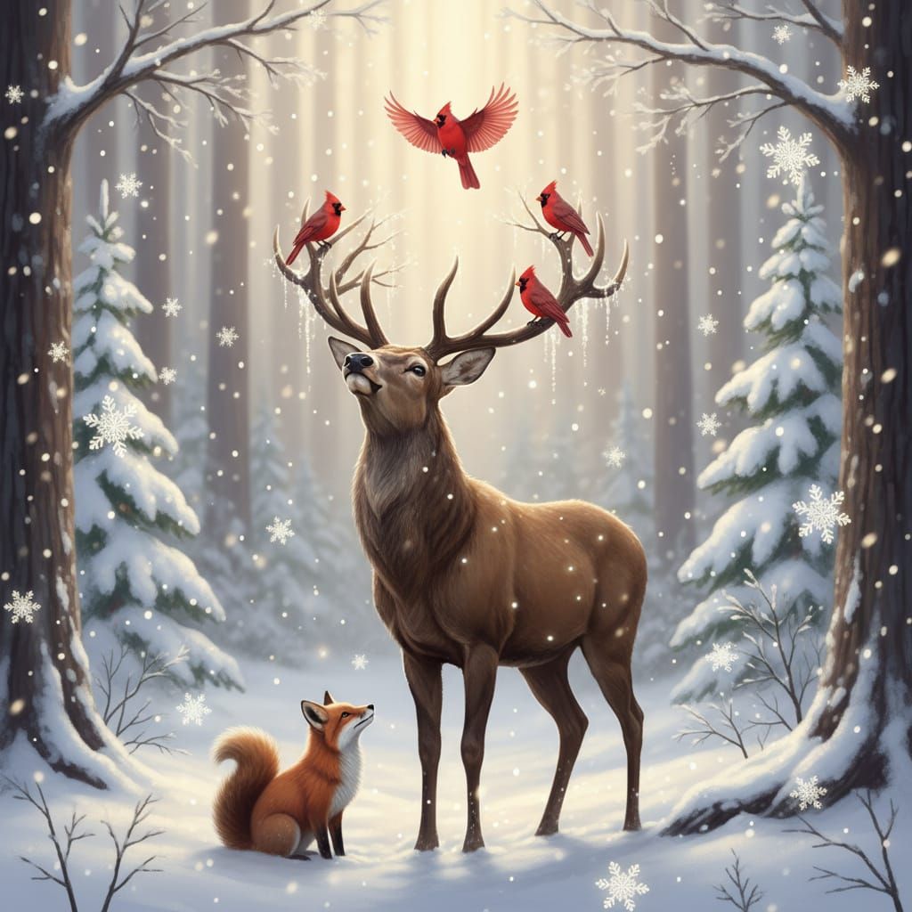 This image shows a majestic brown stag in a serene winter forest, with red cardinals on its antlers and a fox and squirrel at its feet. Features a soft, magical glow and falling snowflakes, creating a peaceful, ethereal scene.