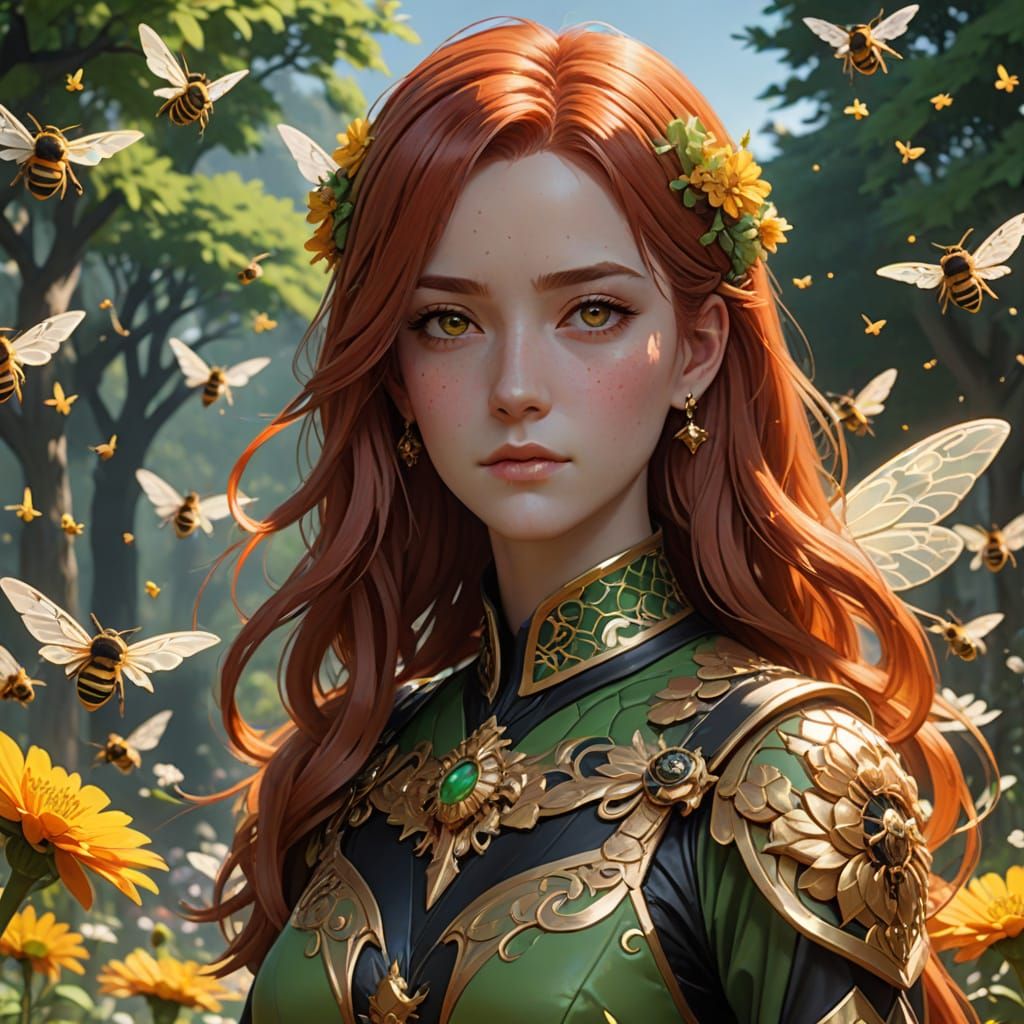 Lady Tudor red hair green eyes orange and yellow dress bees Eva green By artist "anime", 3d anime art, inspired by WLOP, Artstation, #genshinimpact pixiv, extremely detailed, aesthetic, concept art, ultrafine detail, breathtaking, 8k resolution, vray tracing