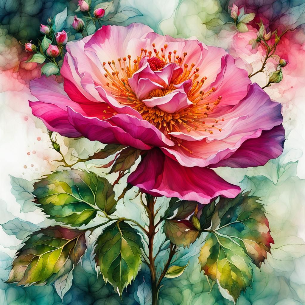 A digital double exposure artwork of a wild rose with greenery and flowers in its petals set against a lush backdrop. The image has a stylized watercolor art aesthetic with flowery fractal colors.