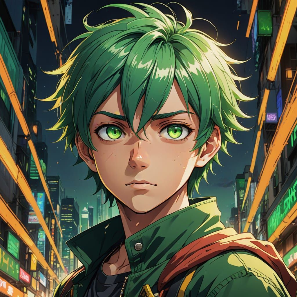 This image shows an anime boy with striking green hair and eyes, captured in a dynamic pose with vibrant colors and detailed textures.