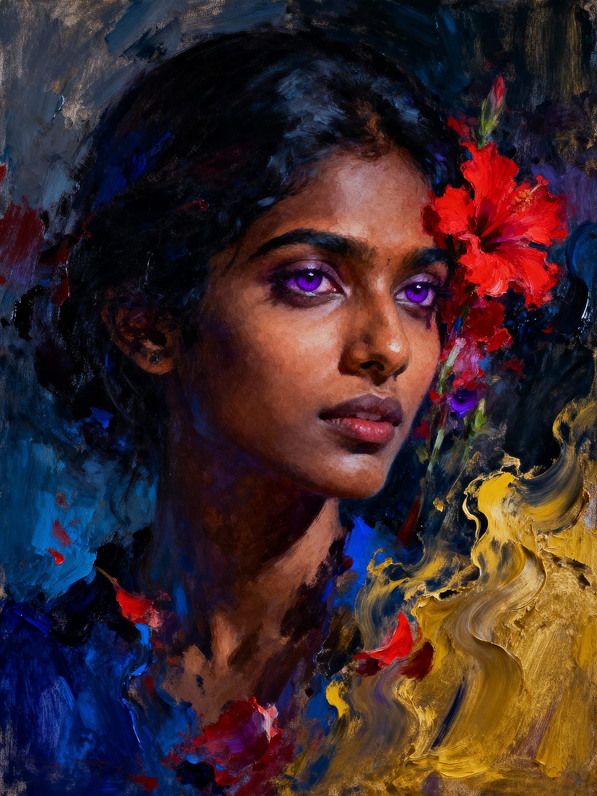 A surreal abstract impasto oil painting 3/4 portrait of a dark-skinned Hindi woman with natural hair and deep amethyst eyes with vibrant Vermilion flowers blooming across one side of her face, her form partially obscured in a dreamy blur by thick, sculpted layers of paint. Her delicate features and the ...
