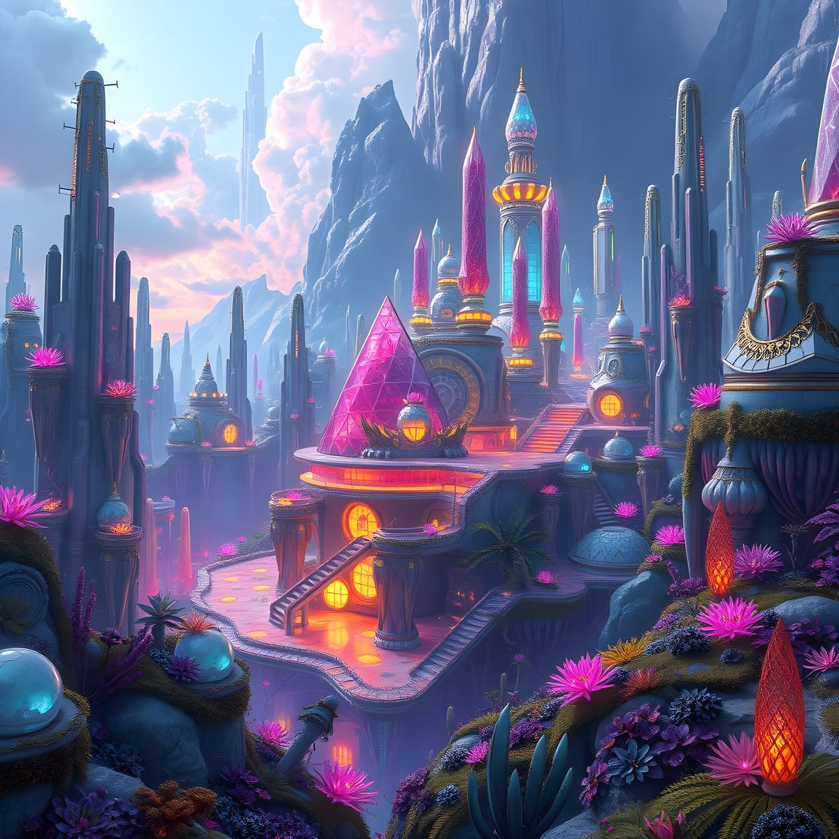 This image depicts a futuristic settlement of crystalline structures harmoniously blending into lush, vibrant alien landscapes, characterized by intricate detail and a palette of deep, enchanting colors.