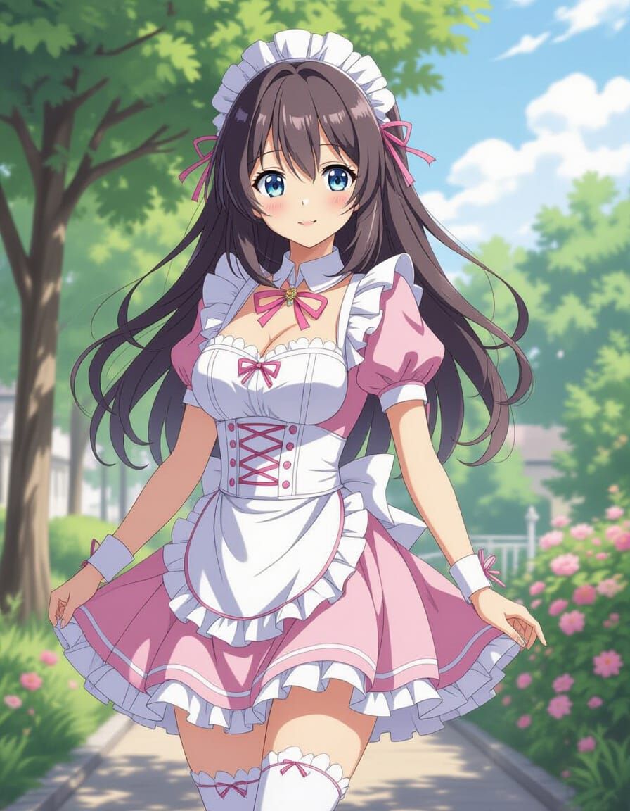 This image shows a cat-girl maid with a perfect face and an athletic body, dressed in a pastel French maid uniform. The artwork is inspired by anime styles and features intricate details and soft, vibrant colors.