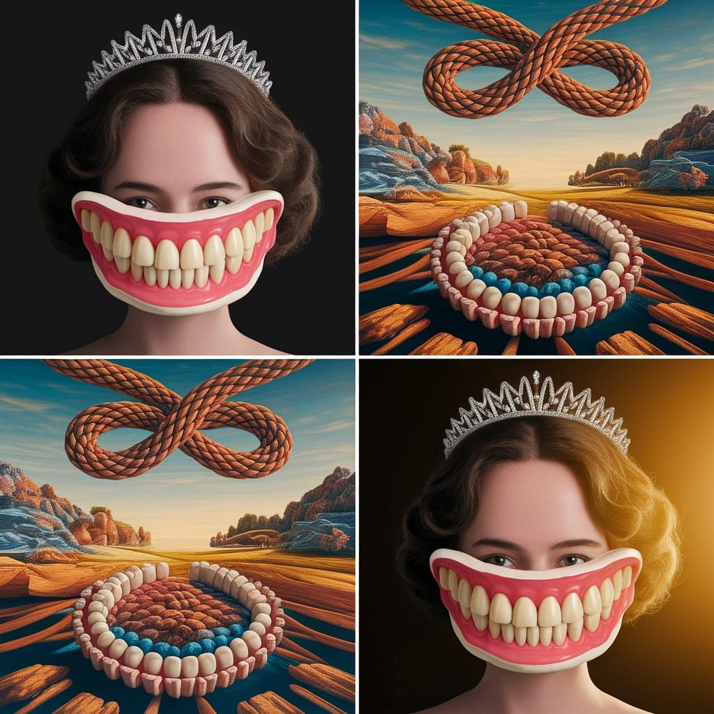 A surreal photograph of a still life in the style of Dutch Golden Age painting. The image features a landscape being consumed by dentures, Escher-like knots, and a shimmering tiara, all under a bright blue sky.