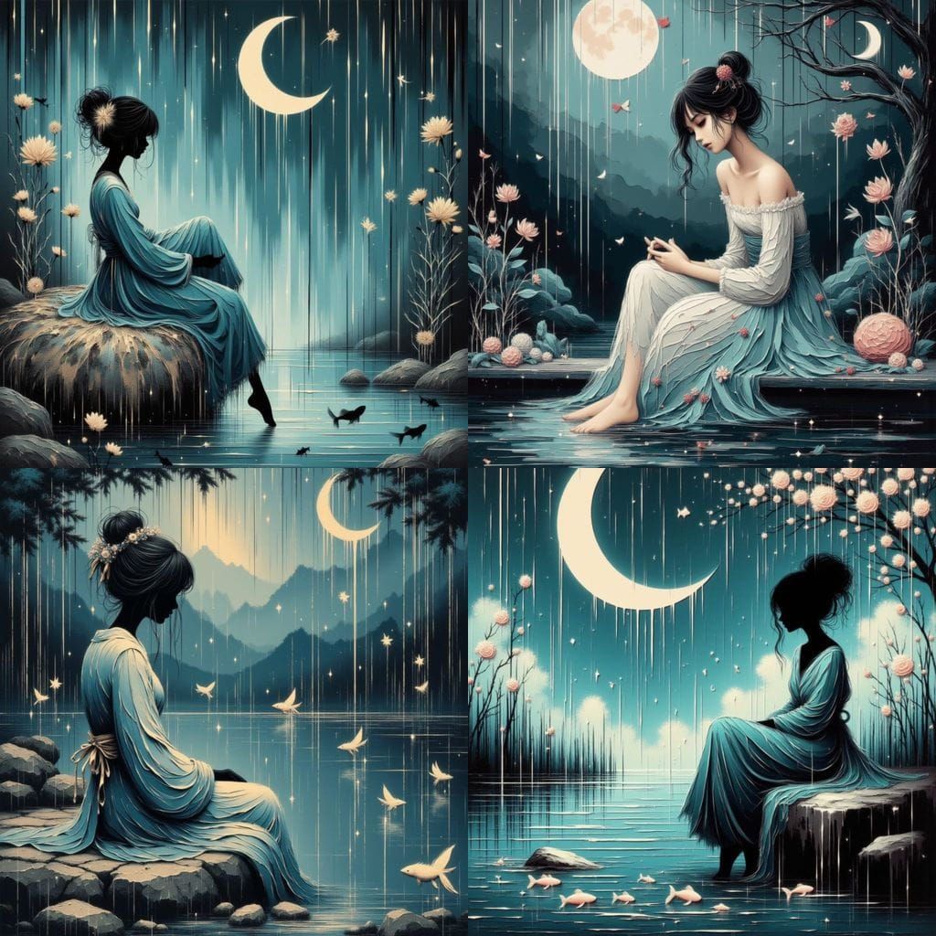 A sensual Japanese woman in light blue, tattered clothing sits on a rock near a fish pond, rendered in a heavy 3D oil brushwork style with large negative space.