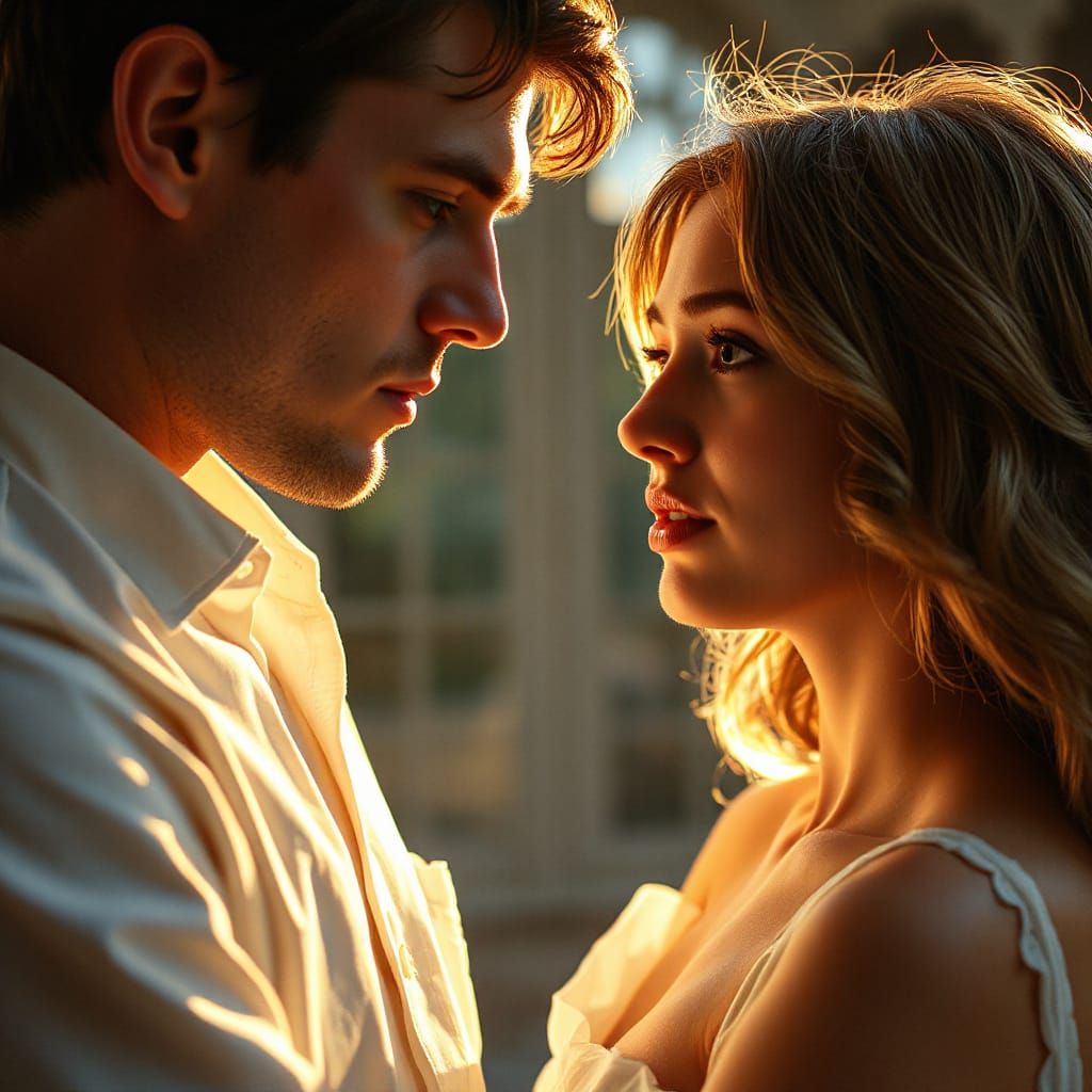 A captivating portrait of two characters in a charged, quiet moment, exuding intensity and emotion, set against a warm, vintage-inspired background, evoking a sense of longing and unspoken words.