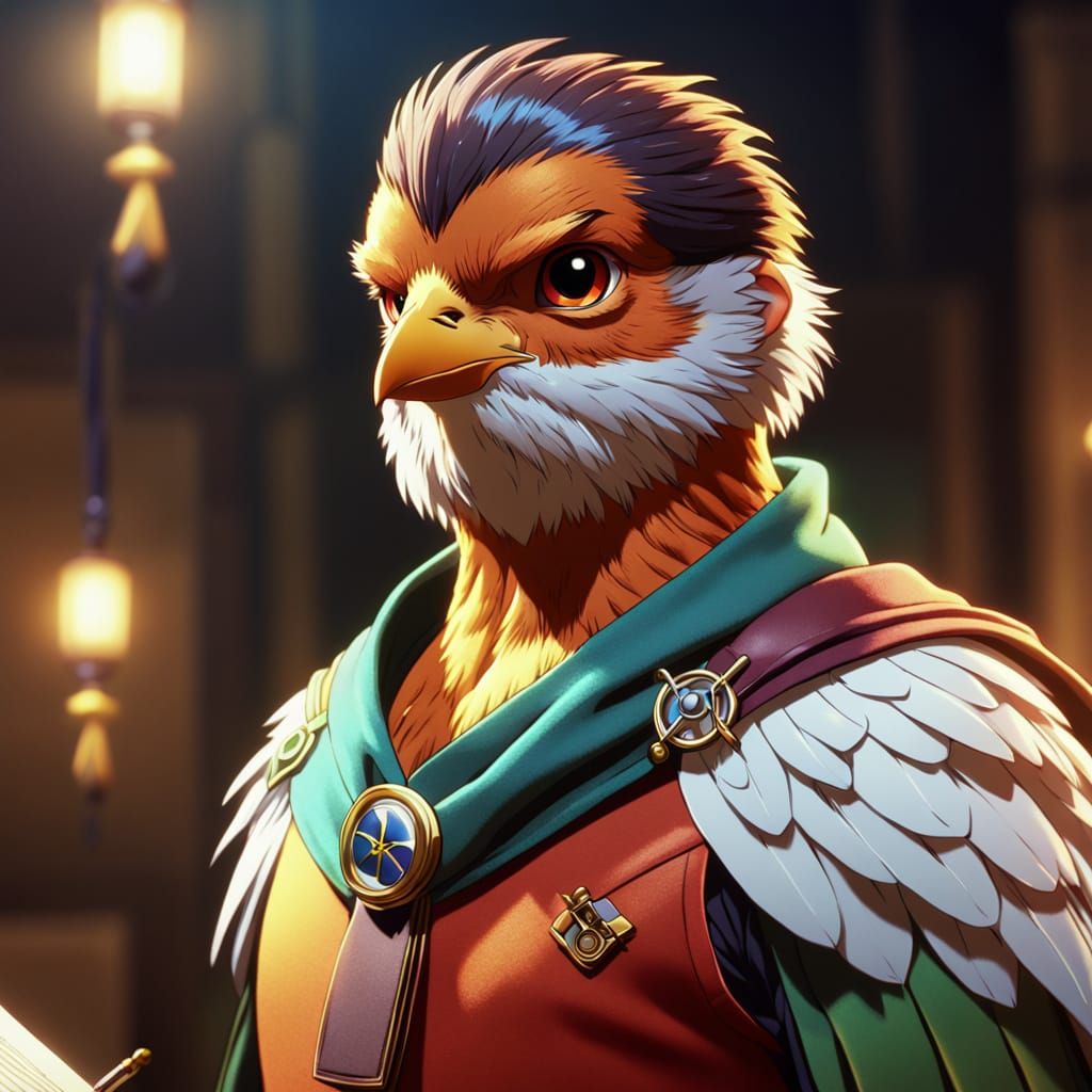 A cel-shaded anime-style image of a robin with bright eyes, admiring his medical degree. The close-up shot features vibrant colors, glistening feathers, and soft, warm lighting.