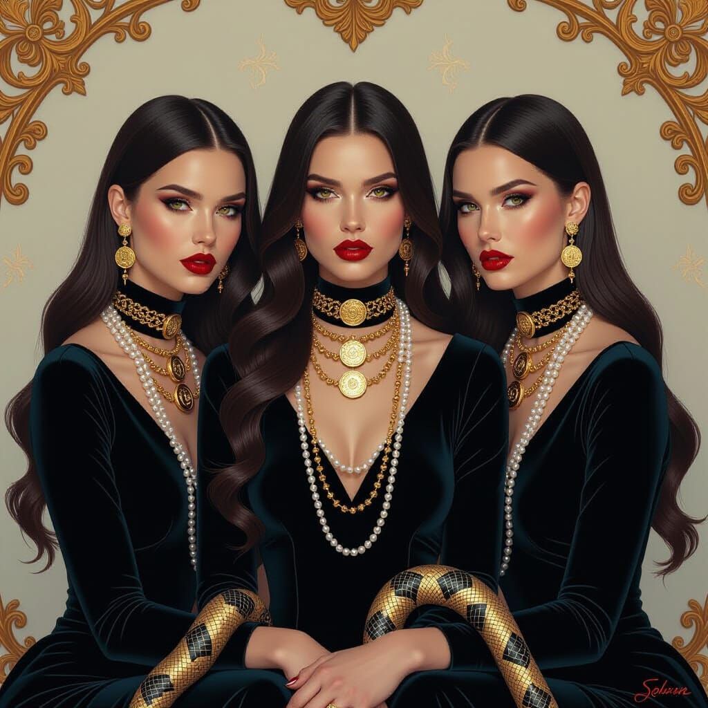 This image shows three women in elegant black velvet dresses, accented by gold and pearl jewelry. Their expressions convey joy, sorrow, and fury in a richly detailed, matte-painted fantasy aesthetic.