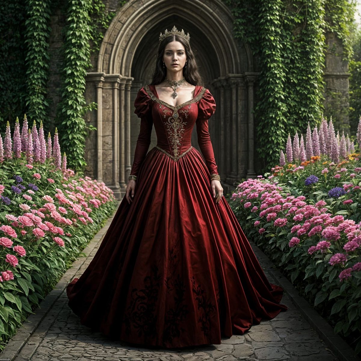 This image shows a powerful princess strolling through a colorful flower garden, exuding an aura of authority and mystery.