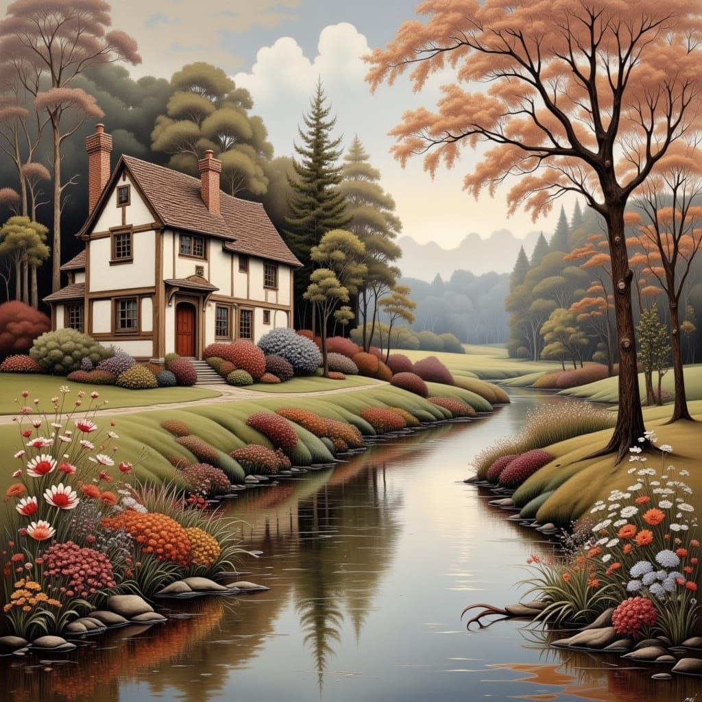 A quaint, shabby cottage by a misty river, rendered in a rich, textured oil painting style with alcohol ink influences.