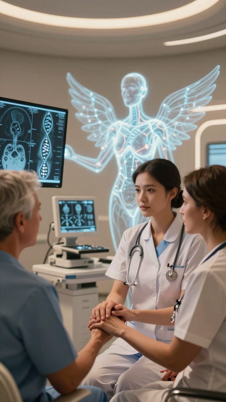 This image depicts a compassionate medical team in a futuristic setting, with glowing AI neural networks resembling wings. It highlights hope and innovation in healthcare with detailed realism.