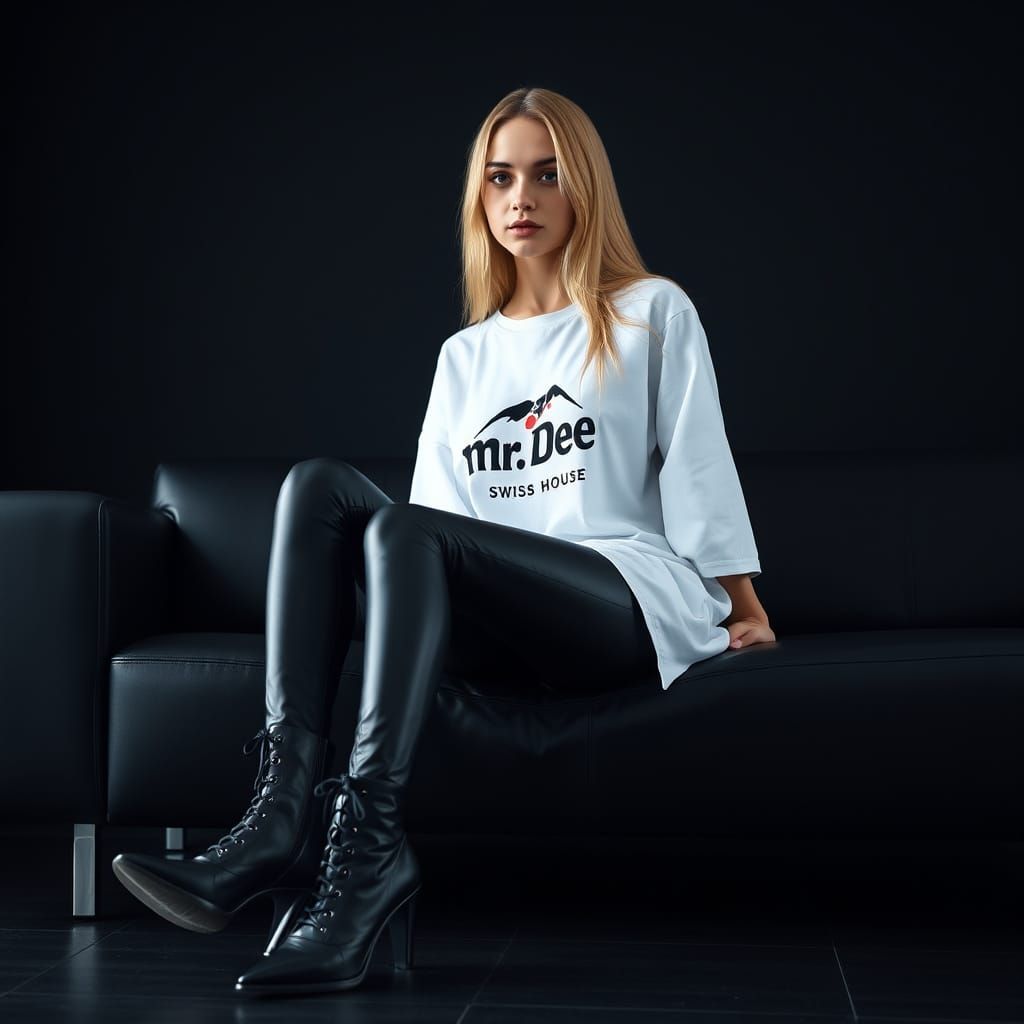 This image shows a stylish woman with long blond hair sitting on a black couch. She is wearing a white t-shirt, black leggings, and high-heeled boots in a modern interior, reflecting a trendy apparel aesthetic.