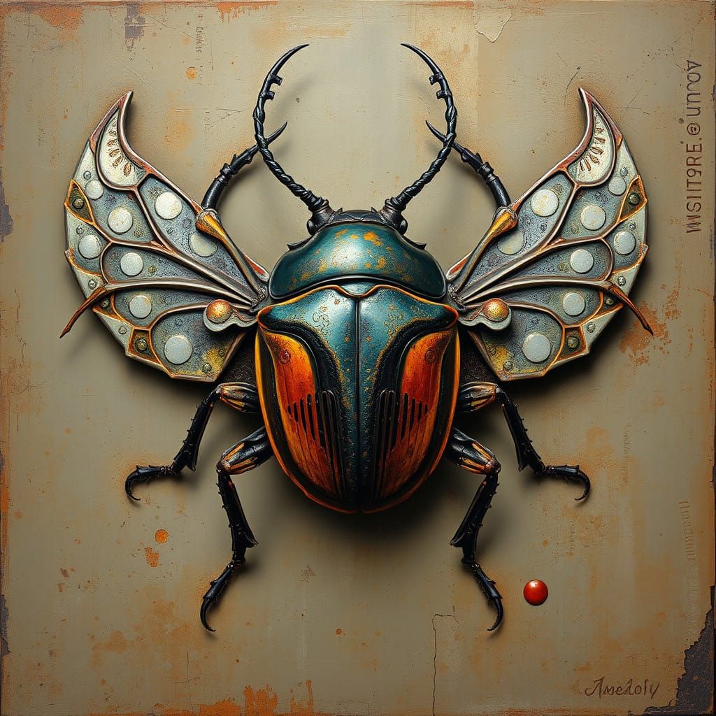 A digital painting shows a rusty, intricately detailed scarab beetle. The artwork blends pop-surrealism with elements reminiscent of Warli painting, featuring a muted color palette accented by vivid highlights.