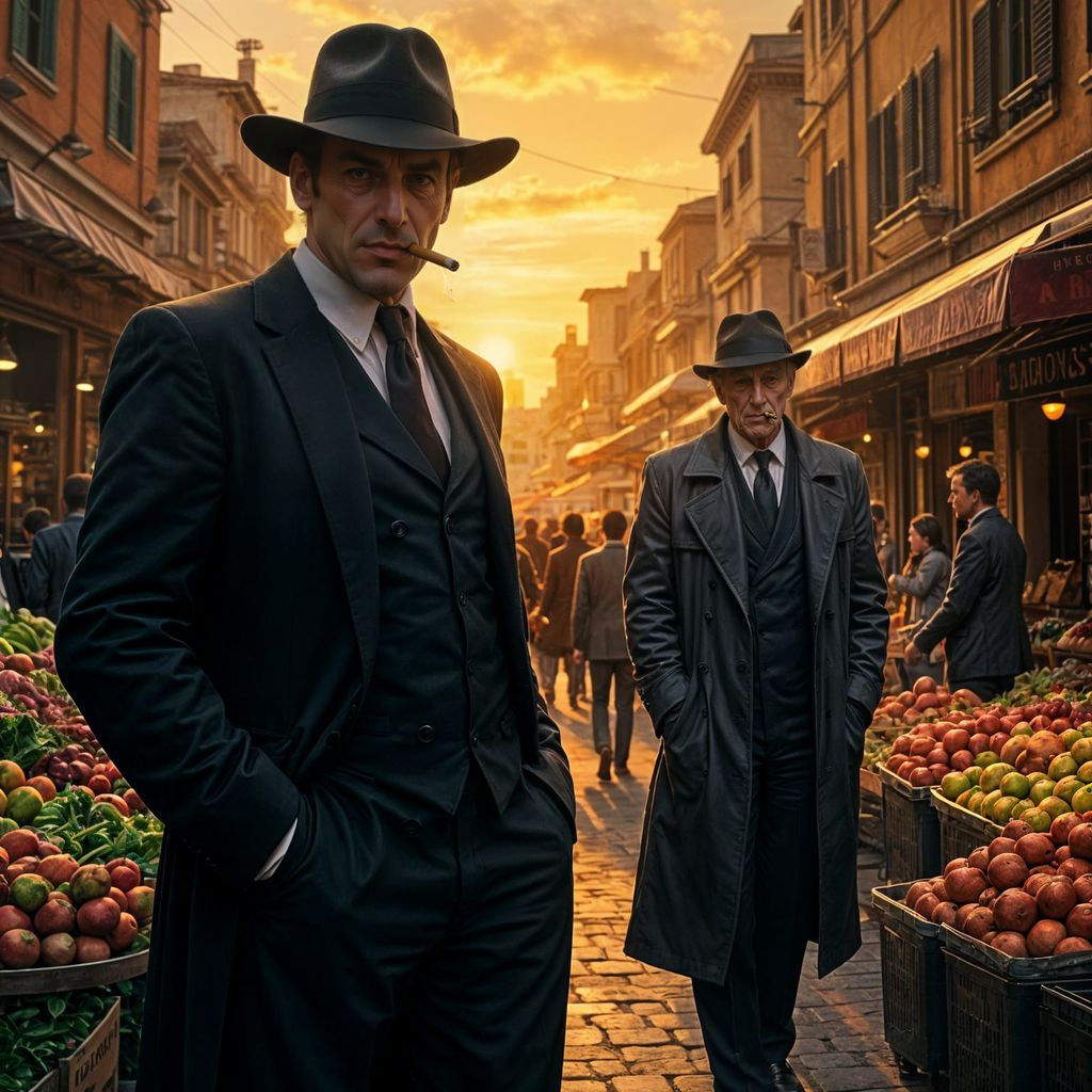 This image shows a movie poster featuring an Italian mafia boss with a cigarette and hat. A second man in a trench coat stands beside him in shadow, with a busy Italian market scene behind.