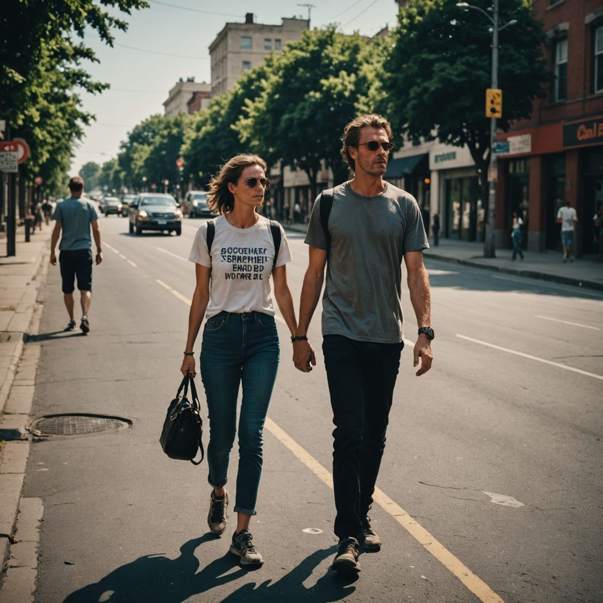 This image shows a man and woman walking on a hot city street on a scorching day. The scene evokes a cinematic film still with a gritty, atmospheric feel.