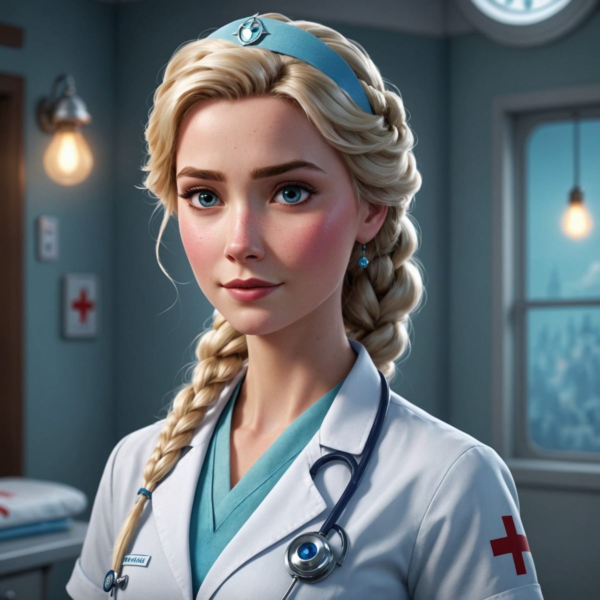 This image is a realistic depiction of Elsa, the Disney princess, in a modern healthcare setting, showcasing her caring side as a dedicated nurse.