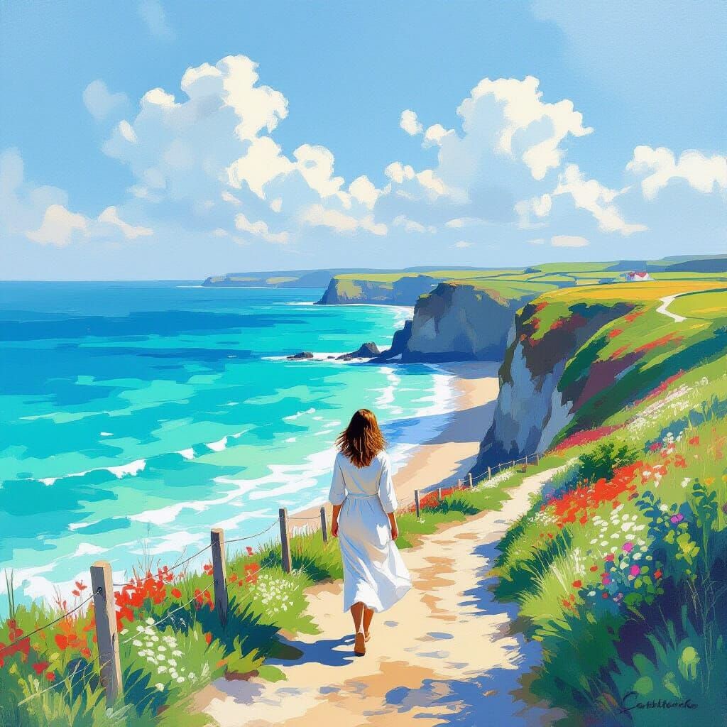 This image shows a serene woman walking along a cliff walk with a turquoise ocean view. The artwork captures a dreamy, vibrant, and ethereal aesthetic.