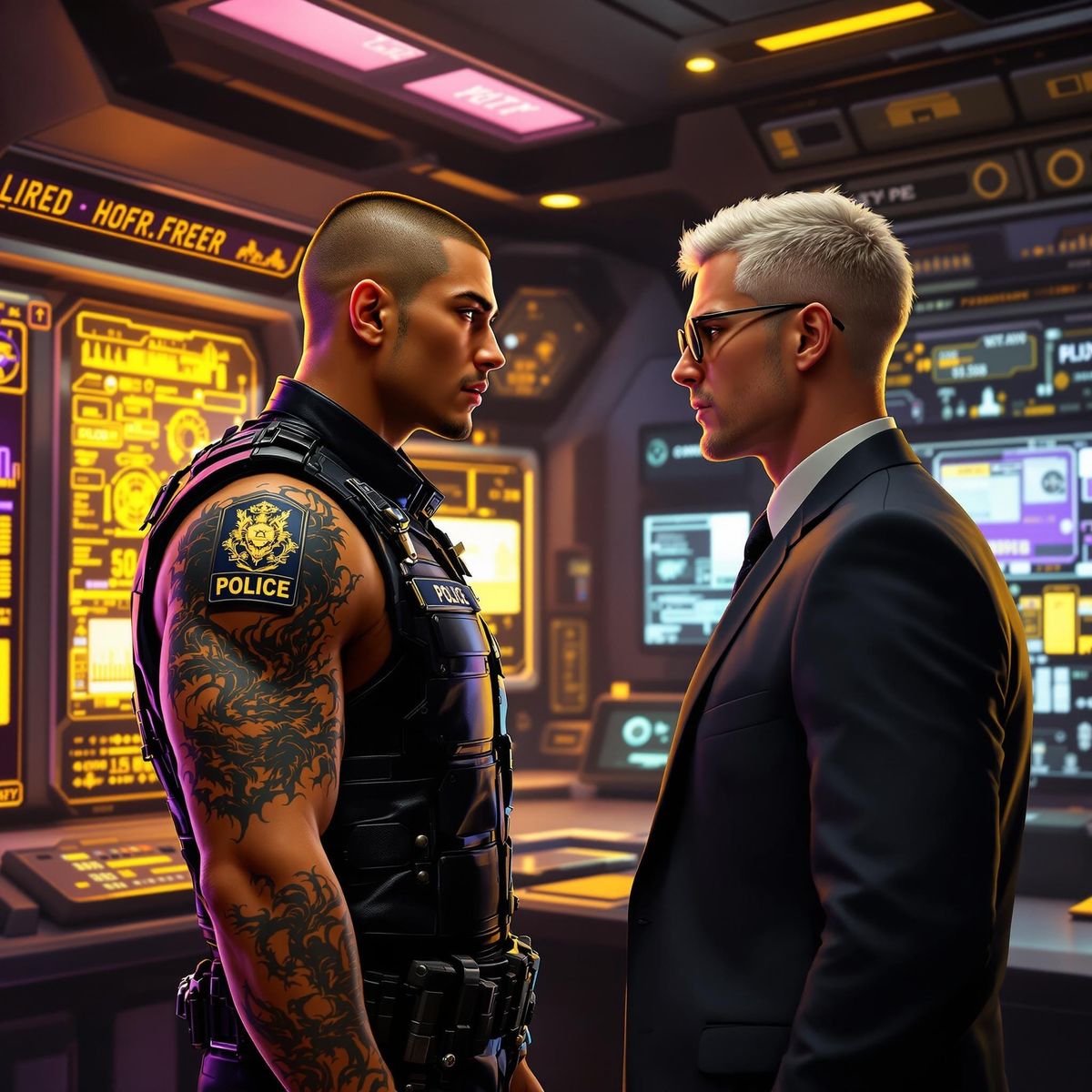 A hyperrealistic image of an Asian motorcycle cop and his boyfriend in a futuristic police station. The scene is lit with dynamic lighting and features advanced technology in a 3D anime art style.