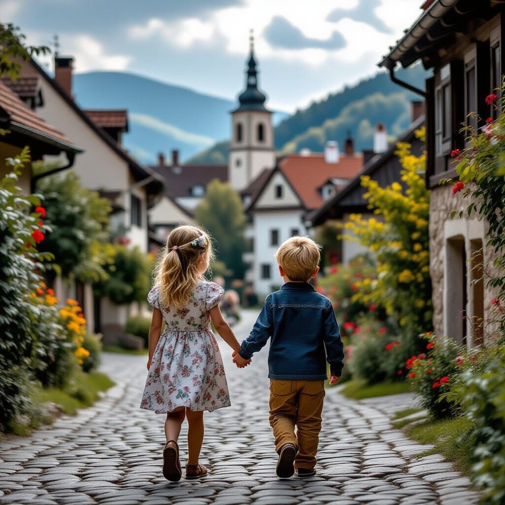 This image shows two children walking hand-in-hand towards a town, on a visit to a renowned painter. Rendered in a hyperrealistic style with sharp focus and moody lighting.
