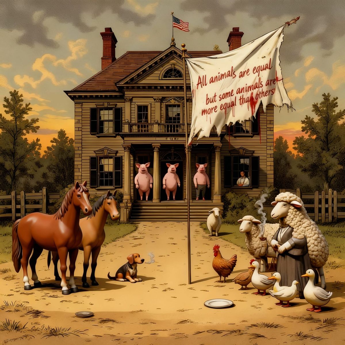 This image depicts anthropomorphic pigs in a luxurious country house, with subservient farm animals. A torn flag and text highlight themes of inequality.