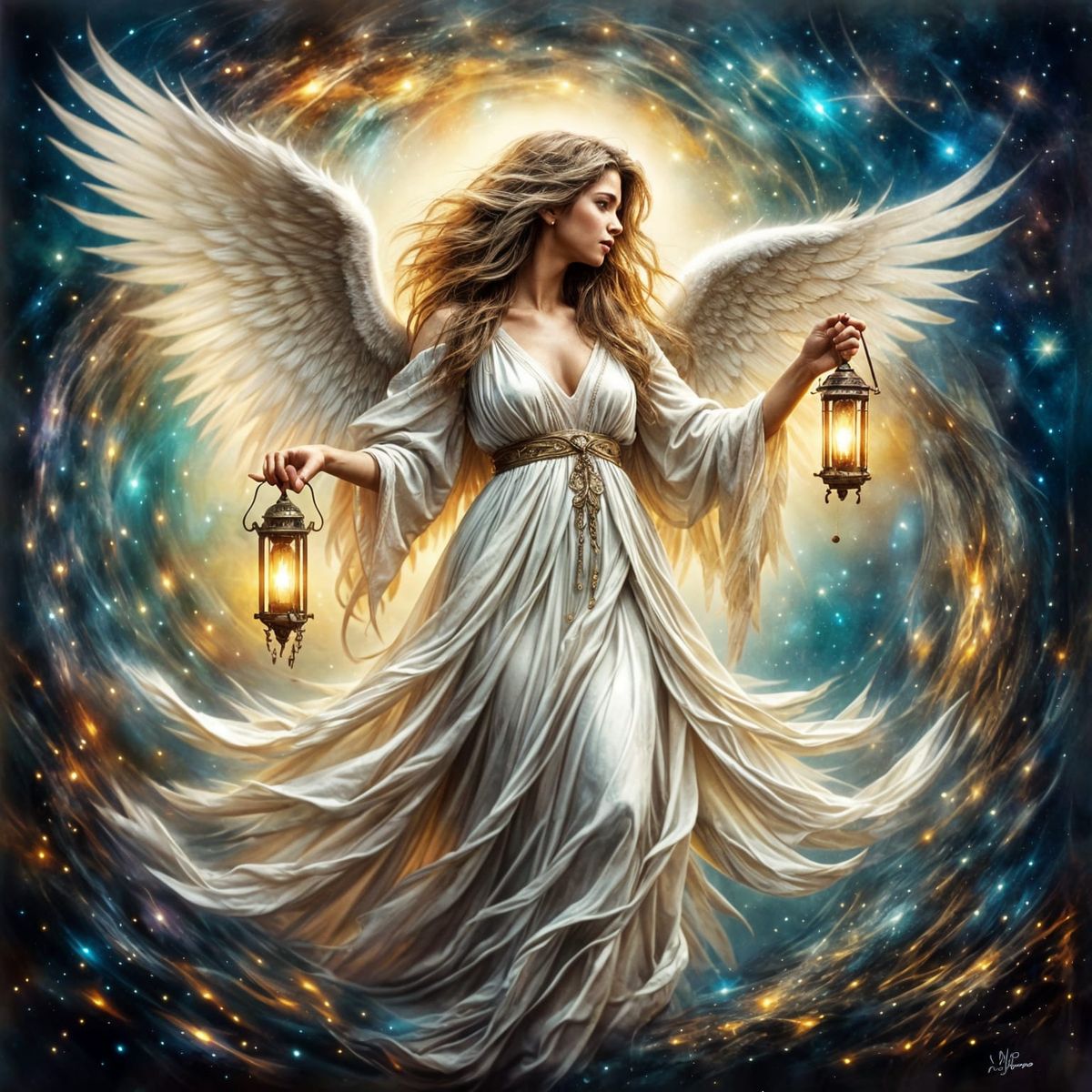 A digital painting of an angel descending from the sky. The angel's wings shimmer with light as she carries a lantern, created in an antique watercolor style, with dynamic lighting and intricate details.