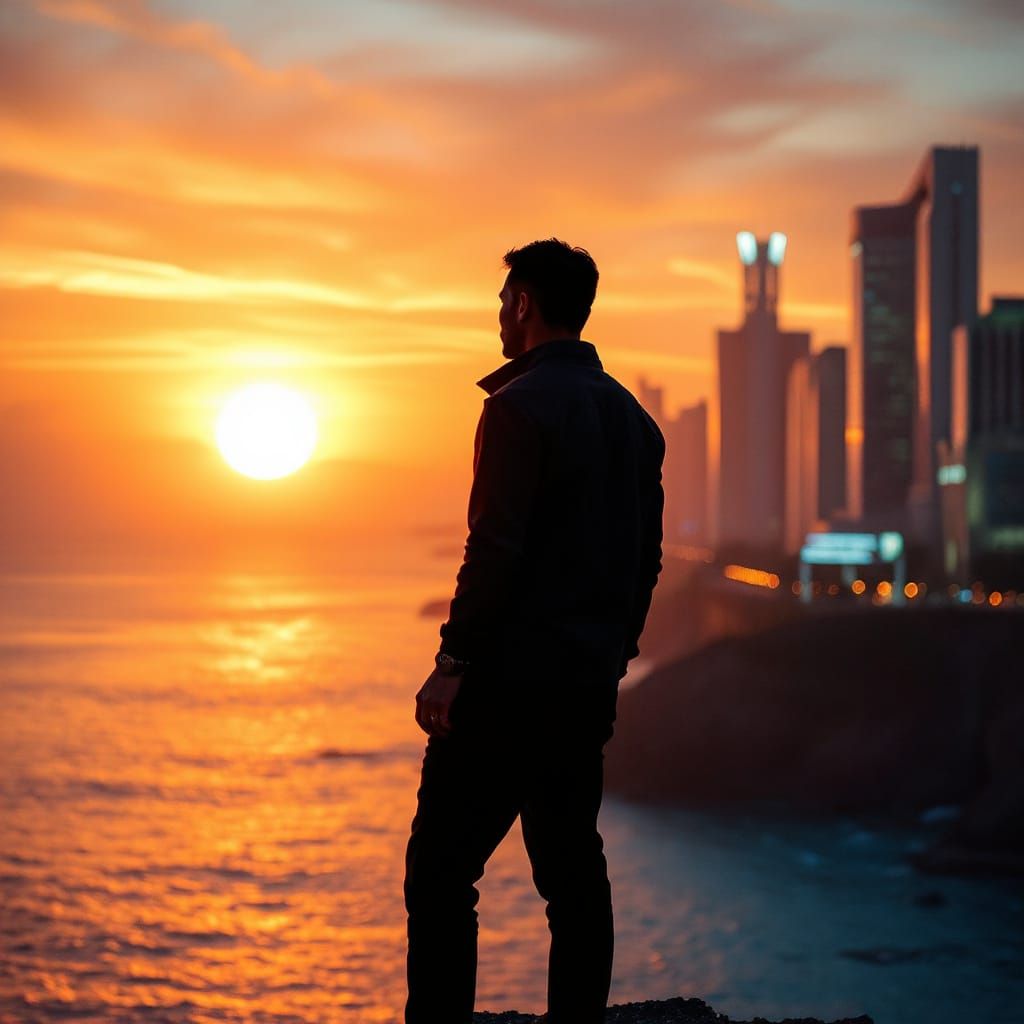 This serene image captures a lone man standing at the edge of a cyberpunk island, lost in thought as the vibrant hues of sunset illuminate the horizon. The photographer's use of natural light and exceptional detail creates a breathtaking scene with a sense of depth and dimensionality.