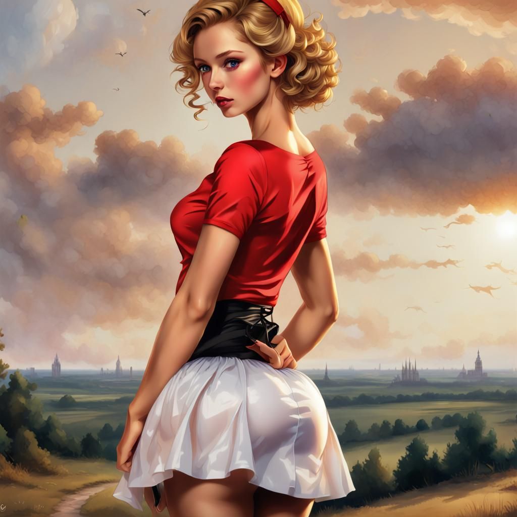 A 3D comic-style image of a beautiful 23-year-old blonde woman with a perfect figure, seen from behind. She is wearing a short miniskirt and black stockings in golden hour lighting.
