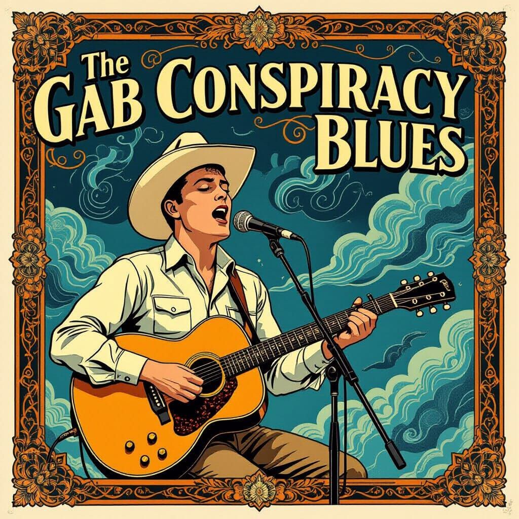 This image shows a blues singer with an electric guitar singing into a vintage microphone. Art Deco patterns, text, and psychedelic clouds create a surreal, dystopian atmosphere with muted colors.