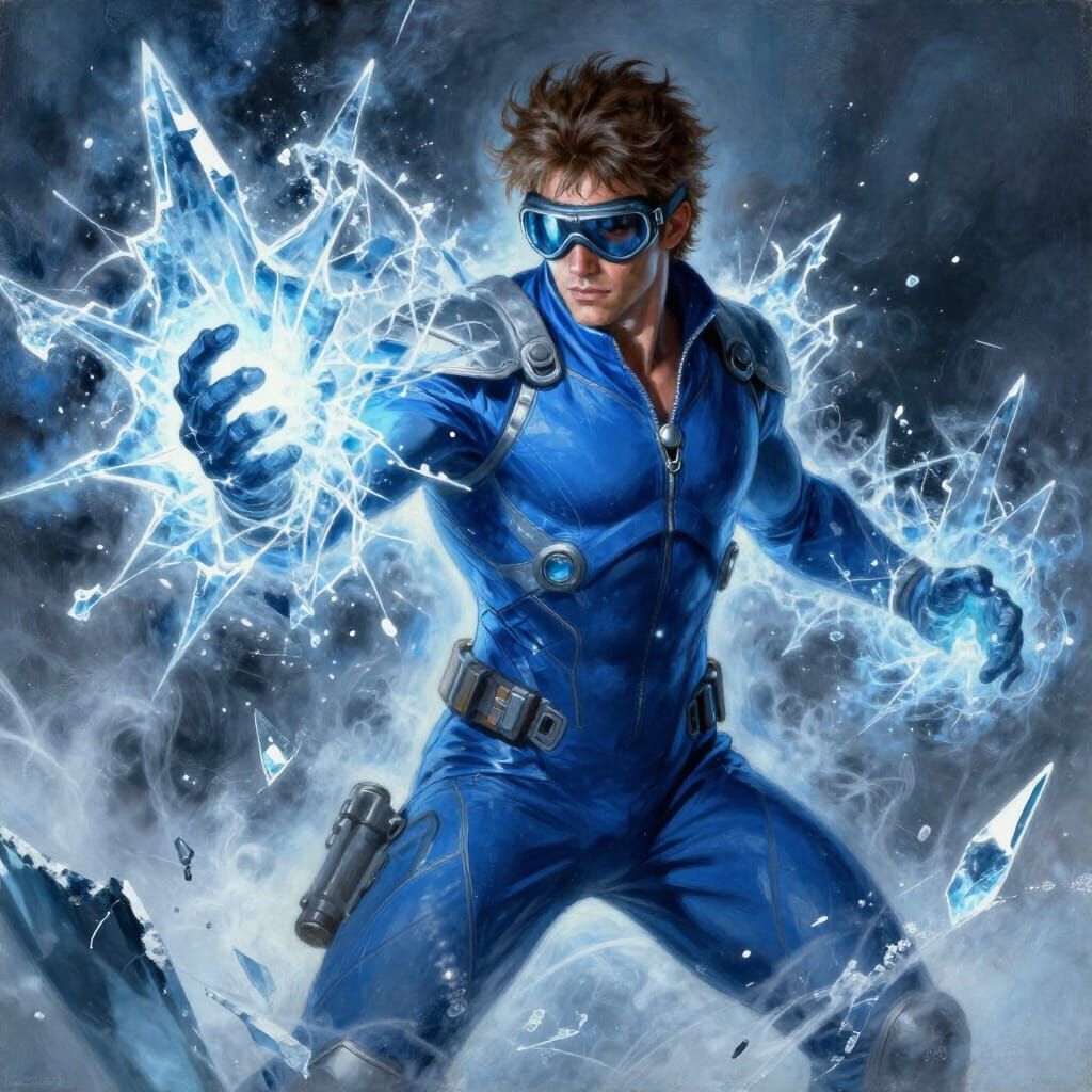 This image shows a muscular man with brown hair and goggles, using powerful ice abilities. The art style is dramatic and high-contrast, with a cold, blue light and atmospheric background.