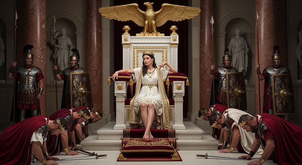 This image shows Empress Messalina on her throne, towering over defeated kings in a luxurious throne room. Legionnaires stand guard as she gestures with a thumbs-down, in a classical Roman style.